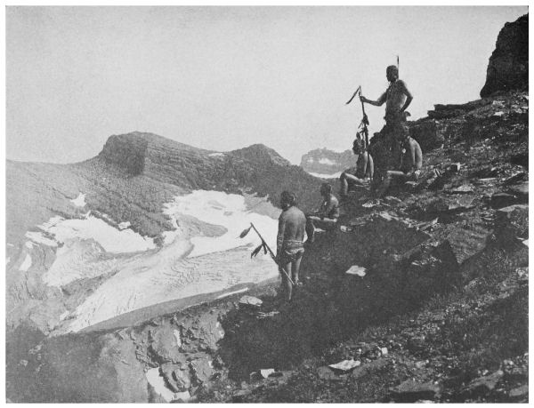 [Pg 234] The way to climb the mountain is by the long, narrow, and in places cut-walled ridge running up toward its summit from the west, and then one has but one cliff to surmount, the one almost at its crest. Only men and goats and bighorn can scale that cliff, but on the extreme summit lies an old buffalo skull, taken there by a Blackfoot in the long ago for a pillow rest while getting his medicine dream. There he fasted for days, and at last, in his weakened condition resulting from want of food and water, got his vision, his medicine which was to be his guardian through life. Who was it that came to him in his fasting dreams? Ancient Buffalo, perhaps; or, maybe, Morning Star. Whoever it was, he went staggering down the mountain and to camp, absolutely certain that he had found his guardian spirit, his medium for favor with the greatest god of all, the Sun, supreme ruler of this earth.