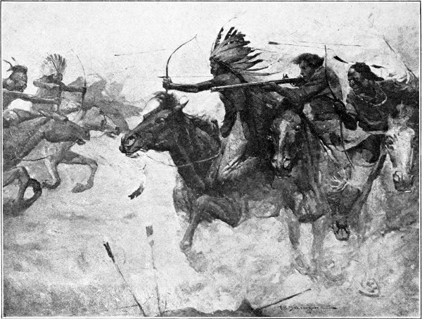 "I don't know why I changed my course and[Pg 220] followed my friend; something urged me to do so. I was about twenty steps behind him as he went up to the tripod and started to lift the medicine sacks from it. As he did so I saw the lodge skin suddenly raised and the medicine man sprang out from under it and seized him from behind. I ran to them as they struggled and struck the big man on the head with my gun and down he went and lay still. He had never seen me, and never knew what hit him. Neither had he made any outcry. As soon as he fell we ran to the stallion, bridled him with his picket rope and sprang upon his back, Little Wolf behind me, and still hanging to the medicine sacks. It was my intention to make the stallion carry us out from the camp as fast as he could go, but there was nowhere any outcry—any one in sight, so I let him go at a walk until we were some distance down the valley, and then hurried him the rest of the way to the meeting place. Our companions were all there with their takings, mounted and waiting for us. Little Wolf got[Pg 221] down and caught a horse and away we went for the north, and it was a big band of horses that we drove ahead of us.