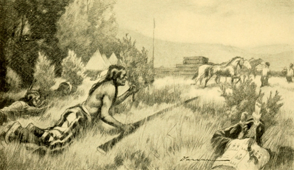 At noon we halted for a short rest. The chiefs at once gathered in a circle and began to plan just what should be done at the mouth of the Musselshell; that is, if Far Thunder and his engagés still held the barricade. Pitamakan and I told how they would be suffering from want of water and urged that we ride as straight as we could to their relief.