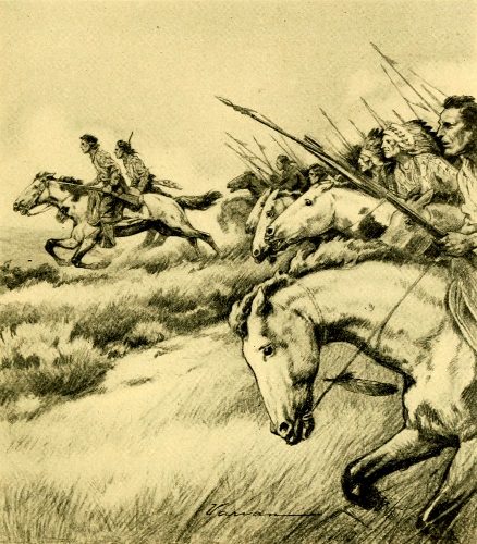 Pitamakan and I rode in the lead with the chiefs, because in a way we were the guides of the relief party. Behind us came the different bands of the I-kun-uh-kah-tsi, or All Friends Society, each one herding its extra horses. Our pace was so fast that there was little opportunity for talk; and Pitamakan and I had no desire to do so. Our thoughts were with our little camp of besieged people.