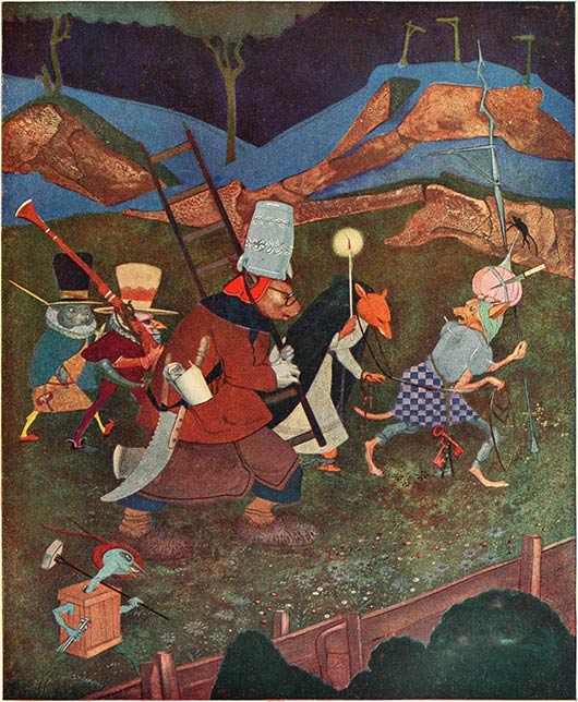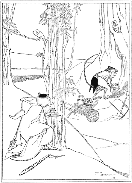 “That’s the way,” said Reynard. “Now I’ll just be[171] walking home to see to my dinner, but I’ll be back presently. Be careful to keep quite still, or you’ll spoil everything!”