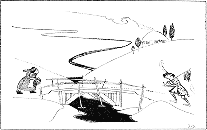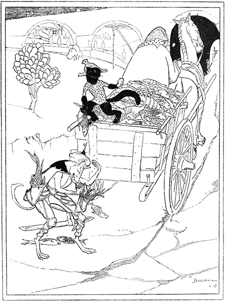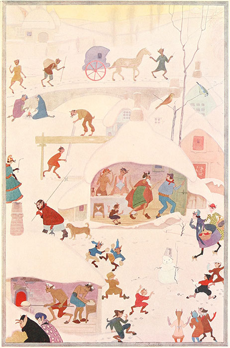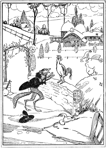 One very cold winter, when the ground was covered with snow and the ponds and rivers were frozen hard, Reynard the Fox and all the other animals went out to enjoy themselves by sliding and skating on the ice. After a time Reynard began to feel hungry, so he wandered off by himself in search of something to eat. He nosed about here, and he nosed about there; he lay in wait behind bushes in the hope of being able to catch a bird; he lurked by the walls of farmhouses ready to spring out upon any unsuspecting chicken that might show itself, but all in vain. The birds were wary, and the fowls were all safe in the hen-houses.