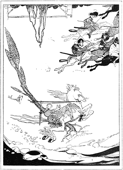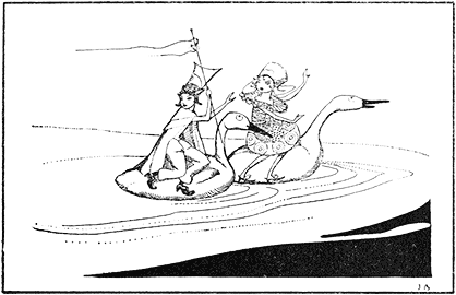 Quickly then, Margot took out the strip of carpet and laid it upon the ground. Immediately it turned into a wide and swiftly flowing river. The witch gave a cry of rage, and tried to wade after her, but the flood mounted swiftly, first to her knees, and then to her waist. Another moment and she would have been swept away, but taking a nutshell from her pocket she set it afloat upon the waters, muttering a charm as she did so. Then the nutshell turned into a little boat, into which the old crone pulled herself, and, paddling with her broom, made shift to cross the river.