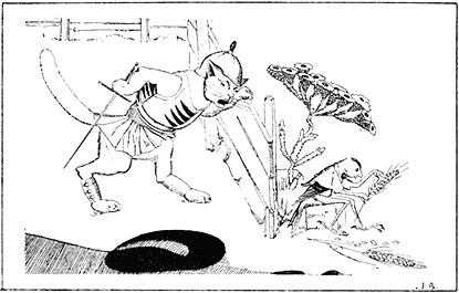 Disappointed with his lack of success Reynard betook himself to the river, now covered with a glistening sheet of[170] ice, and there, under the shelter of a bank, he found a hole in the ice which had not been frozen over. He sat down to watch the hole, and presently a little fish popped up its head for a breath of air. Reynard’s paw darted, and the next moment the unfortunate creature lay gasping on the ice. Fish after fish the fox caught in this way, and when he had quite satisfied his hunger he strung the remainder on a stick and took his departure, not forgetting first of all to offer up a prayer for the repose of his victims.