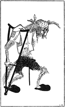 One day as the witch sat there, she saw a little girl gathering berries in the wood. The sight made her show her toothless gums in a malicious grin and she muttered to herself: “Wait there, wait there, my ducky, my darling, till I come to you, for your flesh will be very sweet.” Then she put on a long cloak and took a walking-staff in her hand and went down the stairs.