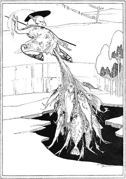 “Do you see that hole, cousin?” said Reynard. “That is where the fish come up to breathe. All you have to do is to sit on the ice and let your tail hang down into the water. After a time the fish will come to bite at it, but don’t you move. Sit quite still until the evening; then you will find a score of fishes on your tail and you can pull them out all together.”