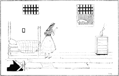 So Margot went with the witch into the gloomy tower, not so much because she wanted the milk or the cake, but to see the pretty things in the cupboards, and no sooner was she within than the witch fell upon her, and bound her fast with a cord, and carried her up to the topmost room, where the cat was sitting blinking its green eyes. Then the old witch opened the door of a dark cupboard, and pushed poor Margot inside, for she meant to keep her there until she had grown bigger and fatter, so that she would make a more satisfying meal. To this end the witch brought her plenty of rich[175] food every day, and from time to time she would feel Margot’s arm to see whether she was plump enough to go into the pot. Poor child, how frightened she was, and how miserable at being kept in that dark cupboard all alone. She cried nearly all day long, but there was nobody to hear her except the witch’s big black cat, and he was a silent animal who did not show his feelings. Margot was almost as sorry for him as she was for herself, for the witch often beat him unmercifully, and the girl tried to comfort him by giving him pieces from[176] her dinner, which she pushed out through the crack under the door.