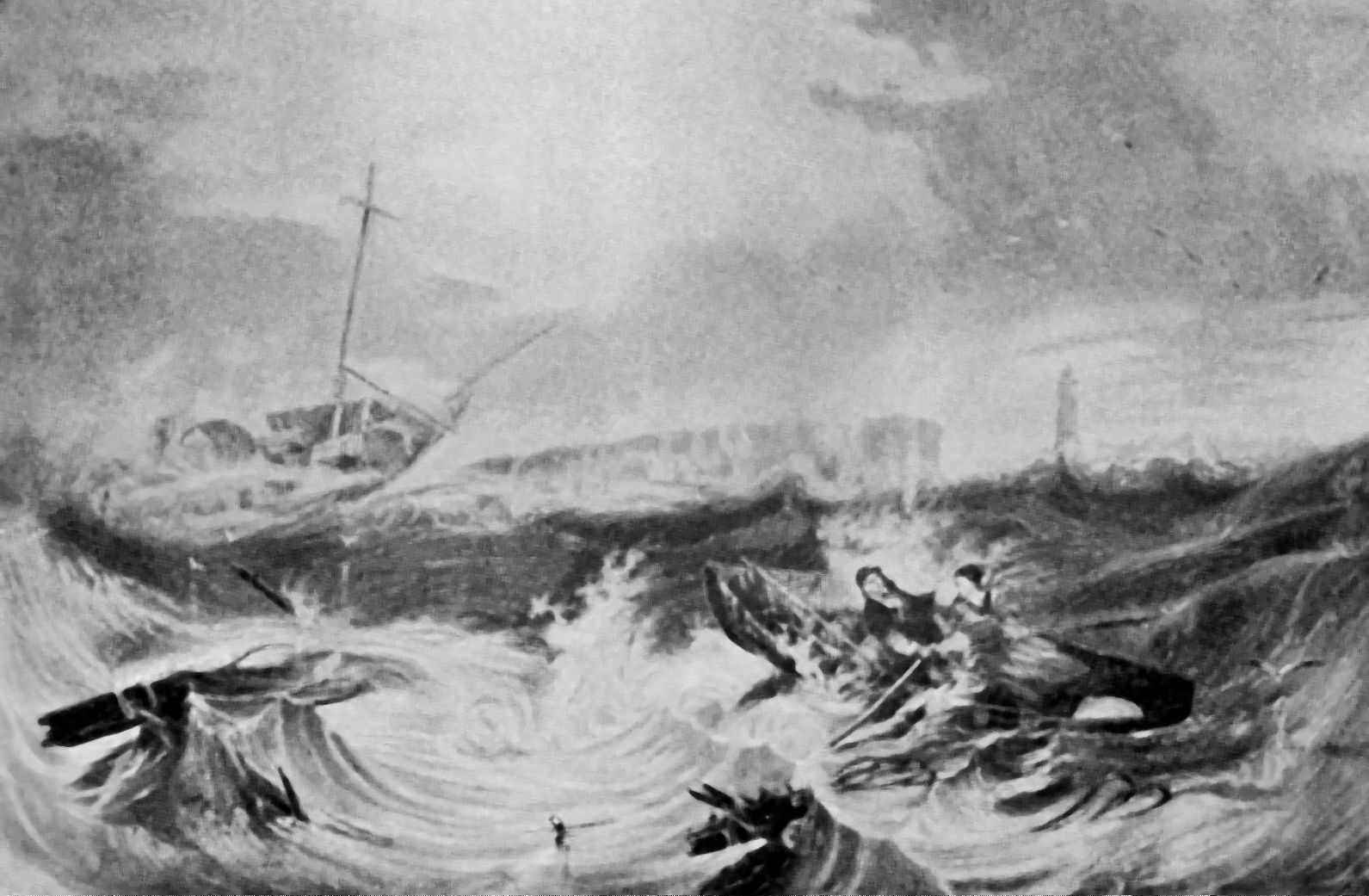 On another occasion one of the fishermen, named Tom Brown, was preparing to go out, with the help of his two sons, in his own fishing coble to the aid of a ship in distress on the reef. A carter had come down to the beach, the better to watch the progress of events, and, terrified by the thundering waves, his horse took fright, and in its plunging drove the cart against the little boat, making a hole clear through one side. “Big Tom,” as he was generally called, merely took off his coat, rolled it into a bundle and stuffed it against the hole. Then he beckoned to another fisherman, saying to him “Sit on that.” The man clambered in, and without the loss of another minute these four heroes set off to save their fellow creatures’ lives, with a broken and leaking boat in a heavy sea. And they did it, reaching the brig only just in time, for it went to pieces a few minutes after the shivering crew had been safely landed.