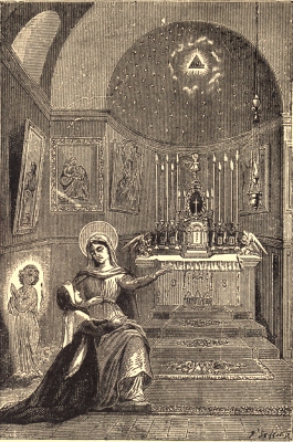 These celestial communications, we may easily imagine, produced in the soul of Sister Labouré profound impressions, which usually remained even after she had finished her devotions, and which rendered her in some degree oblivious of what was passing around her. It is related that after one of these apparitions she rises like the others at the given signal, leaves the chapel, and takes her place in the refectory, but remains so absorbed that she never thinks of touching the meal apportioned her.