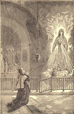 Leaving the church, she went to visit a sick person in the village. Here, she again finds herself with the aged priest, who addresses her in these words: "My daughter, it is well to nurse the sick; you fly from me now, but one day you will be happy to come to me. God has His designs upon you, do not forget it." Amazed and filled with fear, the young girl still flies his presence. On leaving the house, it seemed to her that her feet scarcely touched the ground, and just at the moment of entering her home she awoke, and recognized that what had passed was only a dream.