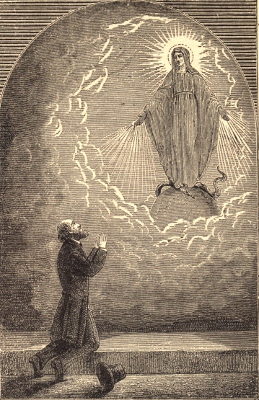 Often has Mary given signal proofs of the pleasure she takes in the devotion of her clients and of the power she possesses to grant their petitions. Graces asked through her mediation have been suddenly obtained; wonders in the way of cures and conversions have been wrought at her shrines; disasters have been averted; plagues have been made to cease; and, to crown all her favors, apparitions have occurred, in which she has shown herself, radiant with the lustre of Heaven, to her loyal servants; and, in some instances, she has left something like the scapular, the Miraculous Medal and the fount in the grotto of Lourdes, as memorials of her visit.