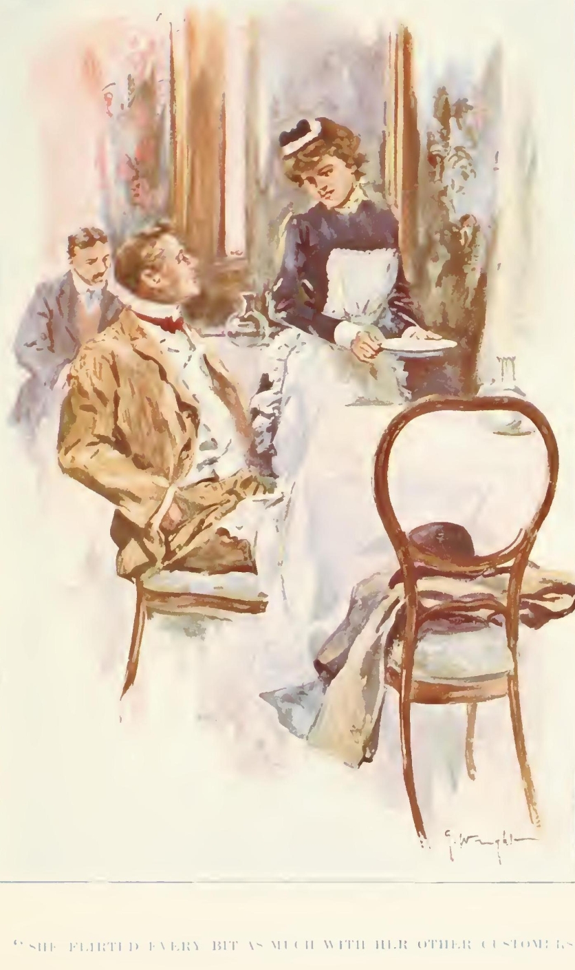 “Next afternoon he found his way to us again, and much the same sort of thing went on, only a little more of it. A sailor-man, so I am told, makes love with his hour of departure always before his mind, and so gets into the habit of not wasting time. He gave her short lessons in English, for which she appeared to be grateful, and she at his request taught him the French for 'You are just charming! I love you!' with which, so he explained, it was his intention, on his return to England, to surprise his mother. He turned up again after dinner, and the next day before lunch, when after that I looked up and missed him at his usual table, the feeling would come to me that business was going down. Marie always appeared delighted to see him, and pouted when he left; but what puzzled me at the time was, that though she fooled him to the top of his bent, she flirted every bit as much, if not more, with her other customers—leastways with the nicer ones among them. There was one young Frenchman in particular—a good-looking chap, a Monsieur Flammard, son of the painter. Up till then he'd been making love pretty steadily to Miss Marie, as, indeed, had most of 'em, without ever getting much forrarder; for hitherto a chat about the weather, and a smile that might have meant she was in love with you or might have meant she was laughing at you—no man could ever tell which,—was all the most persistent had got out of her. Now, however, and evidently to his own surprise, young Monsieur Flammard found himself in clover. Provided his English rival happened to be present and not too far removed, he could have as much flirtation as he wanted, which, you may take it, worked out at a very tolerable amount. Master Tom could sit and scowl, and for the matter of that did; but as Marie would explain to him, always with the sweetest of smiles, her business was to be nice to all her customers, and to this, of course, he had nothing to reply: that he couldn't understand a word of what she and Flammard talked and laughed about didn't seem to make him any the happier.