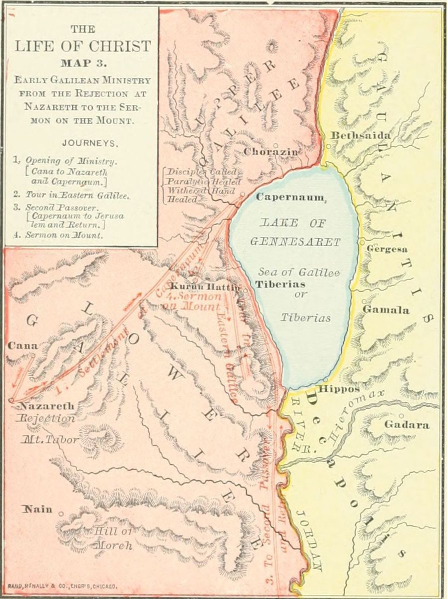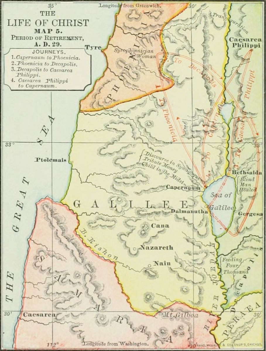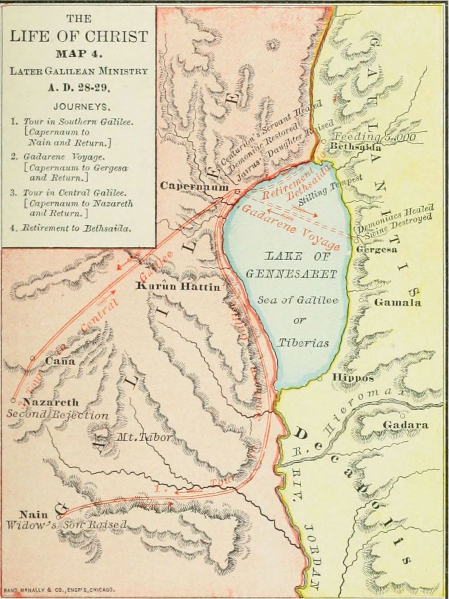 Such devices as these help to inspire the young with an interest in sacred things. They may not yet be prepared to appreciate the night of prayer on the mountain, the agony of the Lord in Gethsemane, or the rapturous experiences of St. John on Patmos; but they may take delight in the land, its customs, its wonderful histories, read with gratification an account of journeys from Dan to Beersheba, with perils from robbers, and the pranks of native children, the lonely horseback ride from Jerusalem down to Jericho, the encampment by the "Fountain of robbers" north of Jerusalem, the loveliness of Nazareth, the beauty of the Sea of Galilee, and the glories of Lebanon and Hermon. Finding delight in these more human things, they may, incidentally, under the leadership of the divine Providence and Spirit, catch glimpses of his face who, by simile and word and spirit, sanctified the land from north to south and from Bashan to the sea.