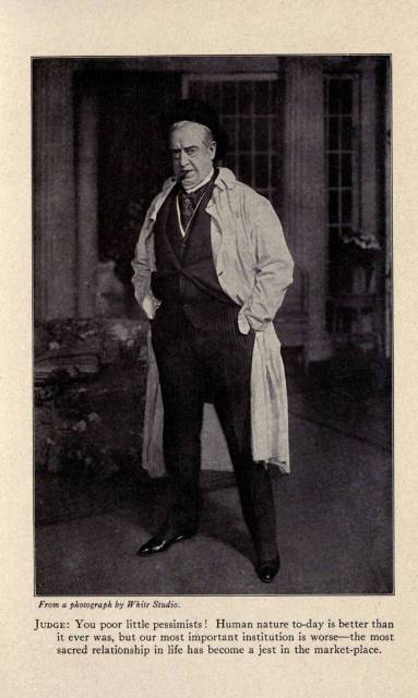 | Judge: You poor little pessimists! Human nature to-day is better than it ever was, but our most important institution is worse—the most sacred relationship in life has become a jest in the market-place | 204 |