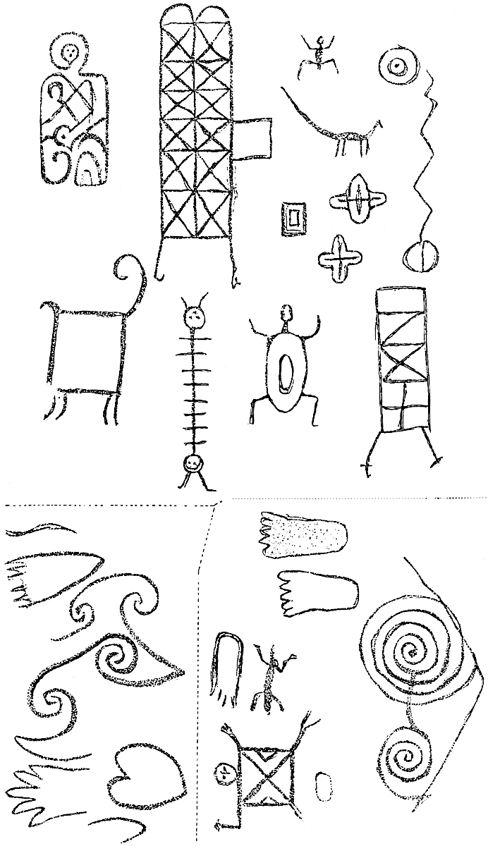 In figure 17 is represented a person running with outstretched banded arms, holding in the left hand a bow, and in the other a straight stick. The head is circular with cross lines, a round, dotted eye, and two triangular ears. Another representation shows a human figure with a bow and arrow before the hands, accompanied by three animals, the middle one being a bird and the two lateral, quadrupeds.