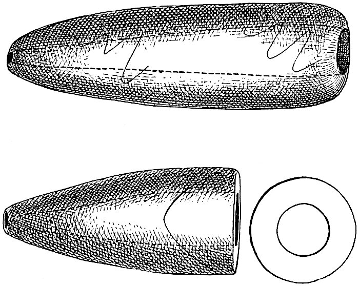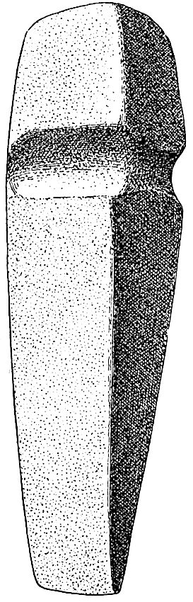 The stone axes are not very different from those of the Rio Grande and the Gila, but it is to be noticed that they are not so numerous as in the latter region, and are probably inferior in workmanship, fine specimens indeed being rare. The majority of the axes (fig. 4) are single grooved, but a few have two grooves. In Dr. Swope's collection, now in the Deming High School, there is a fairly good double-bladed axe.
