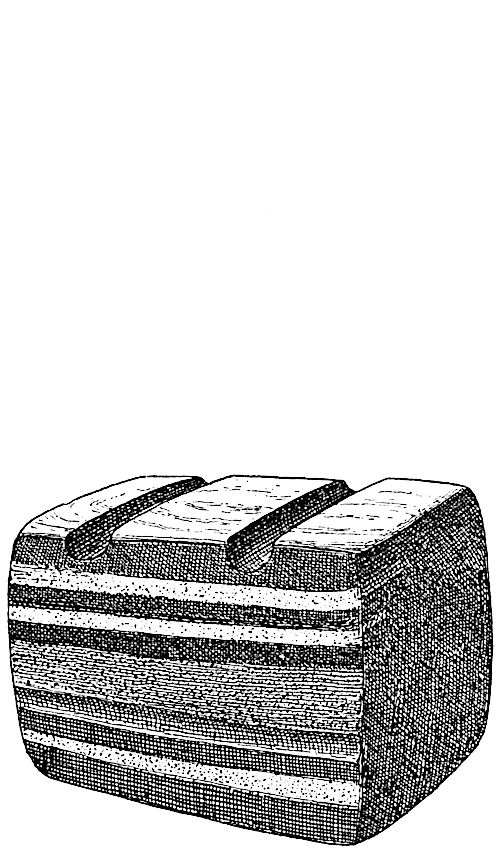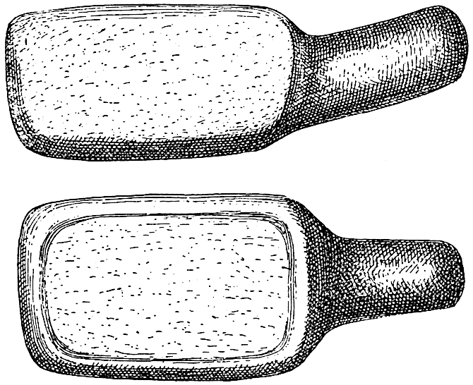 The stone mortars from Mimbres ruins vary in size. Many are simply spherical stones with a depression on one side; others are larger but still spherical, or ovate; while others have square or20 rectangular forms. The most remarkable feature in these is the presence of a handle on one side, which occasionally is duplicated, and in one instance four knobs or legs project from the periphery. These projections appear to characterize the mortars of the Mimbres, although they are not confined to them, as the form occurs in other regions of New Mexico and in California. One of the most instructive of these small spherical paint mortars, now owned by Mr. E. D. Osborn, has ridges cut in high relief on the outside.