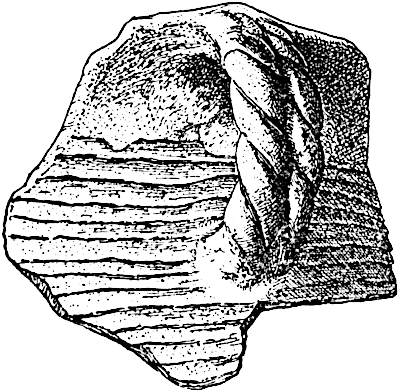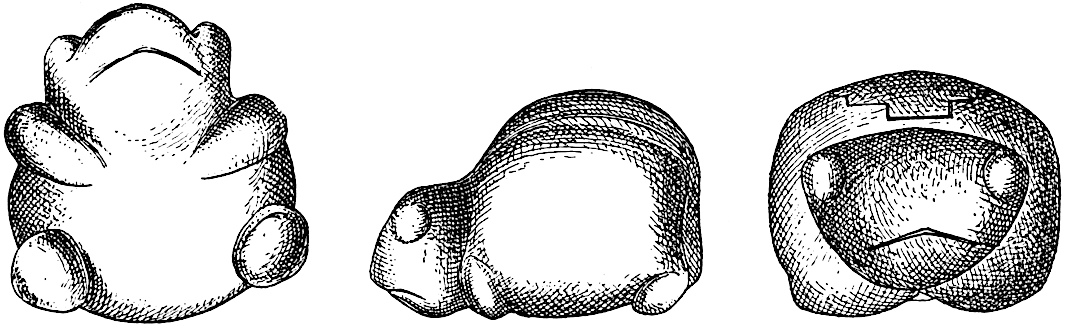 The author excavated at Oldtown a food bowl, the figure on which was undoubtedly intended for a rabbit (fig. 22). The head, ears, body, legs, and tail are well made, leaving no question of the intention of the artist; but if there were any doubt of the identification it is dispelled by the representation of the mouth, on which the sensitive hairs or bristles are represented.