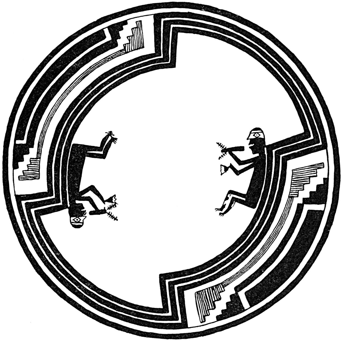 The third human figure, found on a black and white bowl from a Mimbres ruin, is duplicated by another of the same general character depicted on the opposite side of the bowl. These figures (fig. 14) are evidently naked men with bands of white across the faces. The eyes are represented in the Egyptian fashion. In one hand each figure holds a tube, evidently a cloud-blower or a pipe, with feathers attached to one extremity, and in the other hand each carries a triangular object resembling a Hopi rattle or tinkler. The posture of these figures suggest sitting or squatting, but the objects in the extended left hand would indicate dancing. The figure is identified as a man performing a ceremonial smoke which accompanies ceremonial rites.