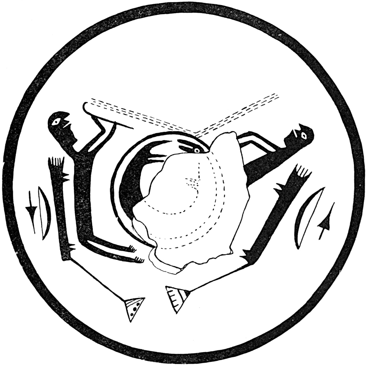 One of the most instructive food bowls found at Oldtown, now owned by Mr. Osborn, has on it a picture of two hunters, one on each side of an animal (fig. 15). One of these hunters carries in his hand a stick crooked at the end, its form suggesting a throwing stick.29 Both hunters have laid aside their quivers, bows, and arrows, which are shown behind them. The picture of an animal between them has been so mutilated by "killing" or breaking the bowl that it is impossible28 to identify it. From the end of this crook to the body of the animal there extend two parallel lines of dots indicating the pathway of a discharged weapon. Near the body of the animal these rows of dots take a new direction, as if the weapon had bounded away or changed its course. The rows of dots are supposed to represent lines of meal by which Pueblos are accustomed to symbolically indicate trails or "roads."