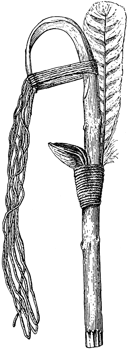 Not all crooked sticks used by the Hopi are prayer sticks, or weapons, for sometimes in Hopi ceremonials a number of small shells are 29tied to the extremity of a crooked stick forming a kind of rattle. In the Flute Ceremony a crooked stick is said to be used to draw down the clouds when the rain they contain is much desired.