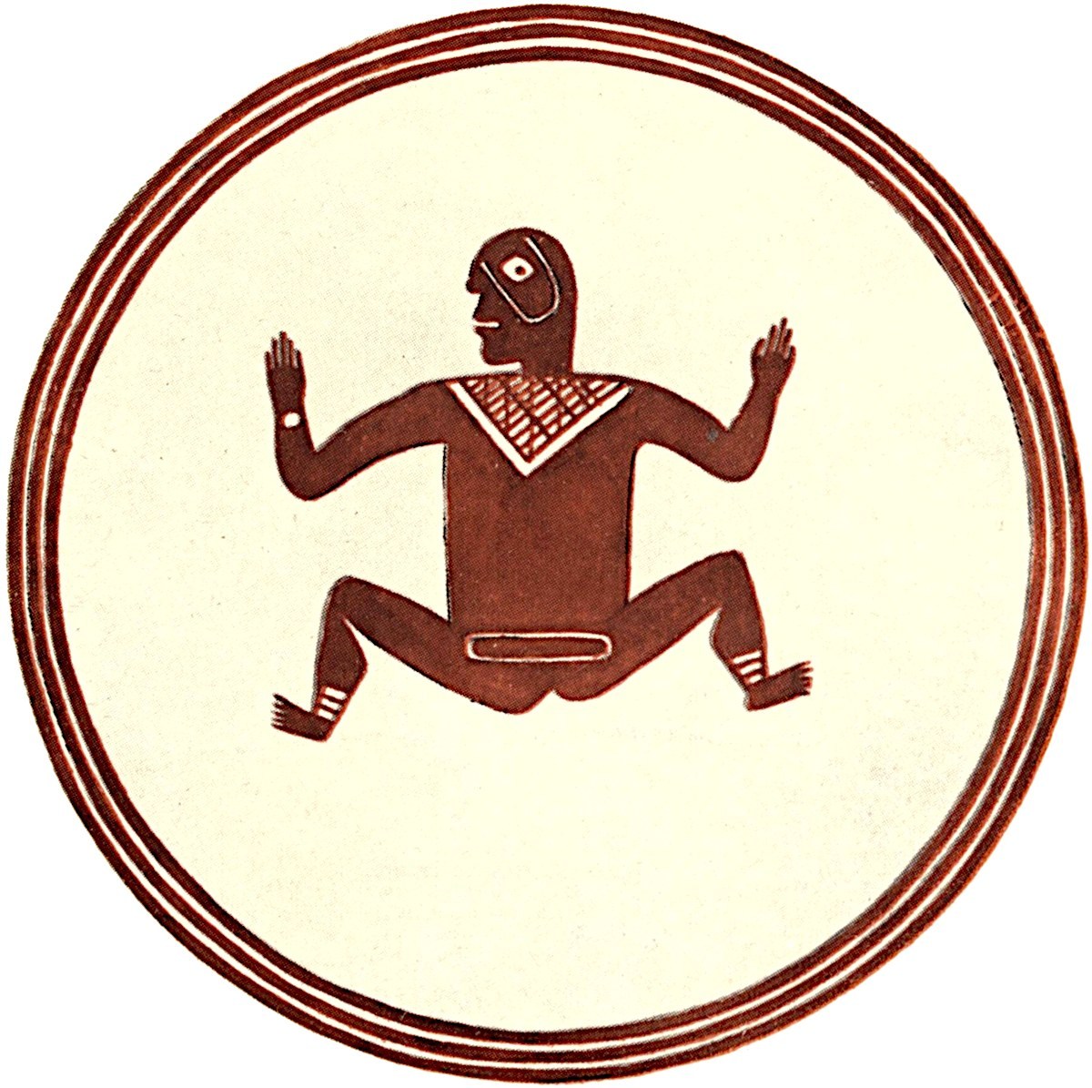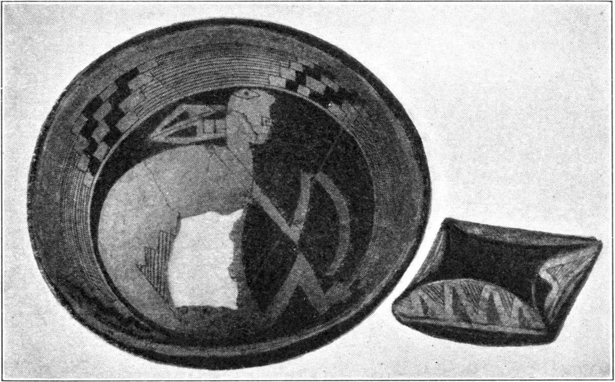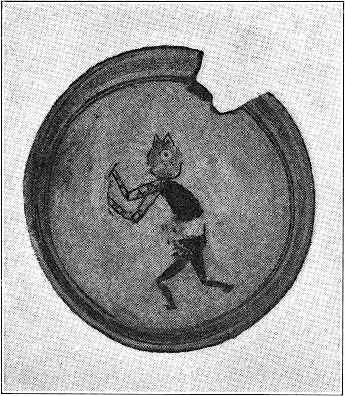 The well-drawn figure painted on a bowl (pl. 1, fig. 2) from Oldtown ruin represents a man with knees extended and arms raised as if dancing. This picture has characteristic markings on the face, but otherwise is not distinctive.