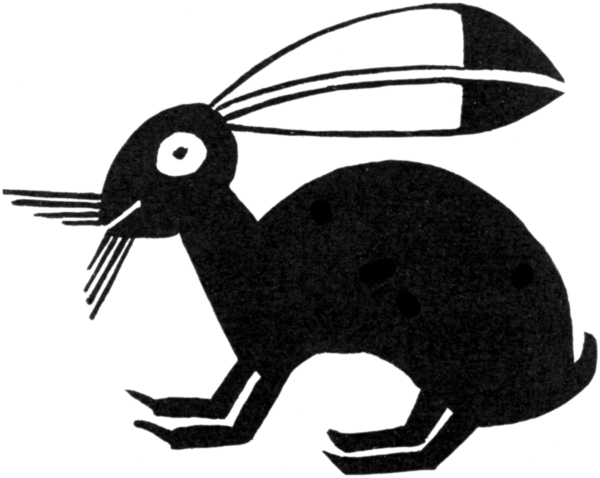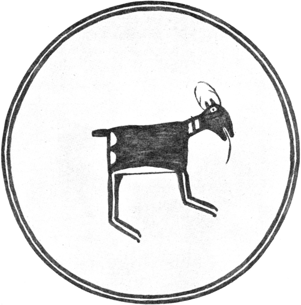Rabbit or Hare.—The pictured representation (fig. 31) of a quadruped whose hindlegs are larger than the forelegs and whose long backward extending ears are prominent features, probably represents a rabbit or a hare. The eyes recall figures of birds depicted on bowls from the Little Colorado ruins in Arizona, where eyes are depicted on one side of the head in violation of a law of perspective in which only one eye can appear on a lateral view. The figure appears to have a tuft of grass in the mouth. The geometric markings on the body are different from those of any known species of rabbit and belong to the category of symbolic designs.
