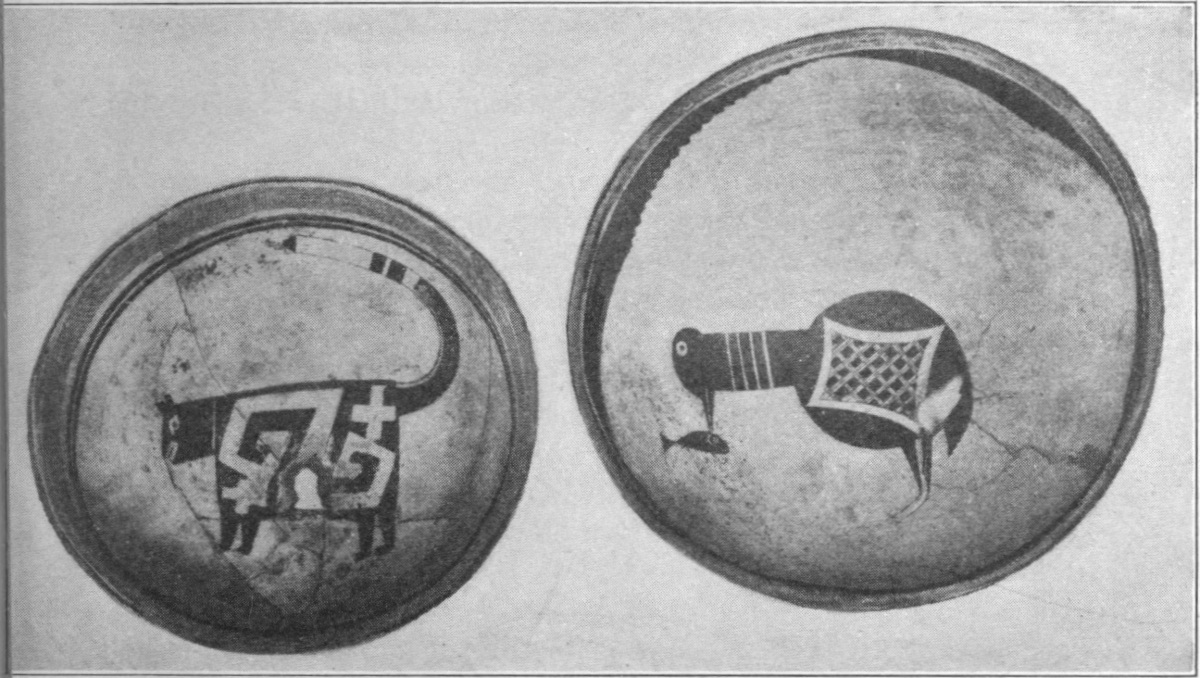 Unidentified Animal.—One of the most remarkable of many figures on bowls from Oldtown in the collection of Mr. E. D. Osborn is shown in figures 27, 29 (p. 38). Three colors enter into the decoration of this bowl, black, white, and brown, and there are two types of ornamentation, one zoic, the other geometric. The bowl itself was much broken when found, but not so mutilated as to hide the main designs.