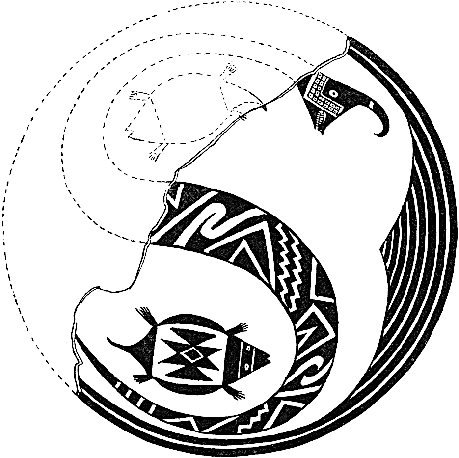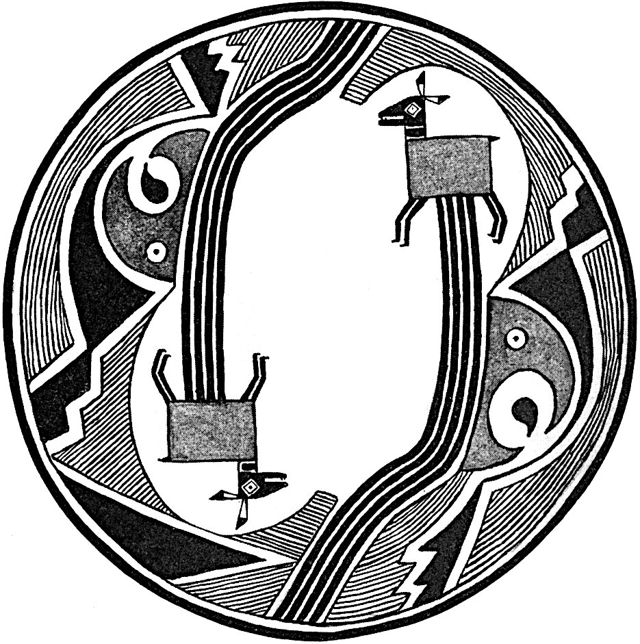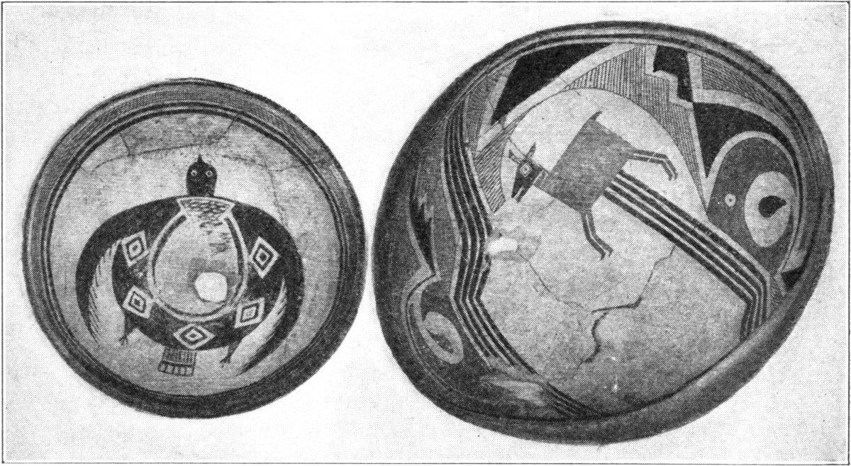 The geometrical designs on Mimbres pottery are rectangular, curved, and spiral, the first form being the most common. These units are arranged in twos or fours, and although they consist often of zigzag or stepped figures, the triangle and rectangle predominate. The geometrical designs are rarely colored, but commonly filled in with hachures and parallel lines. There are seldom decorations on the outside of the Mimbres bowls, in which respect they differ from ancient Hopi (Sikyatki) vessels elsewhere figured.53 Conversely, that part of the interior of the bowl which surrounds the central design, oftentimes elaborately ornamented in Mimbres pottery, is very simply 47decorated in Sikyatki pottery. Encircling lines on Mimbres pottery are continuous, whereas at Sikyatki they are broken at one or more points by intervals known as the "life gateways" or "lines of life."54 The geometrical figures on the inside of every bowl sometimes surround a central region on which no figures of animals or human beings are drawn, but which is perforated.