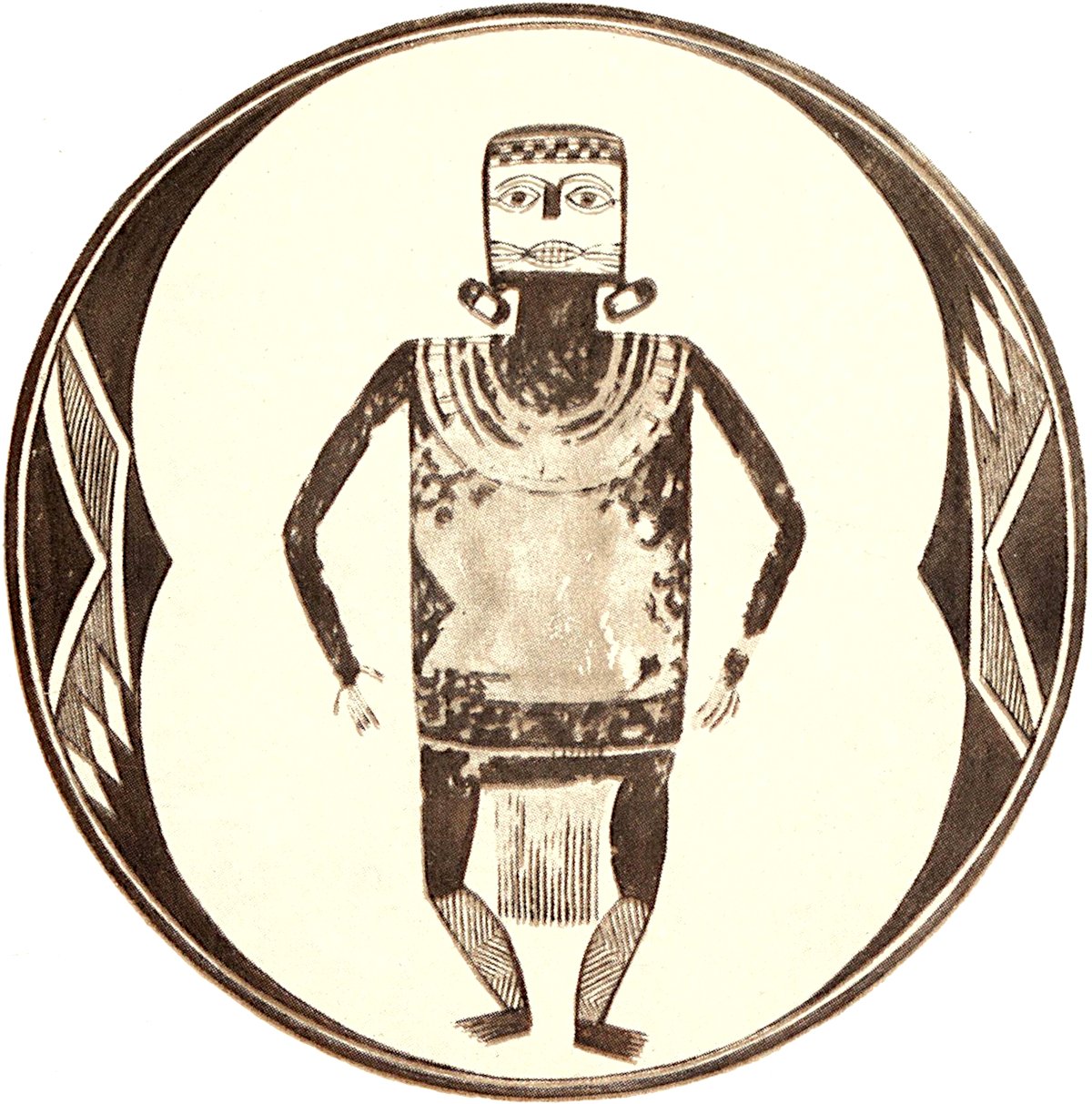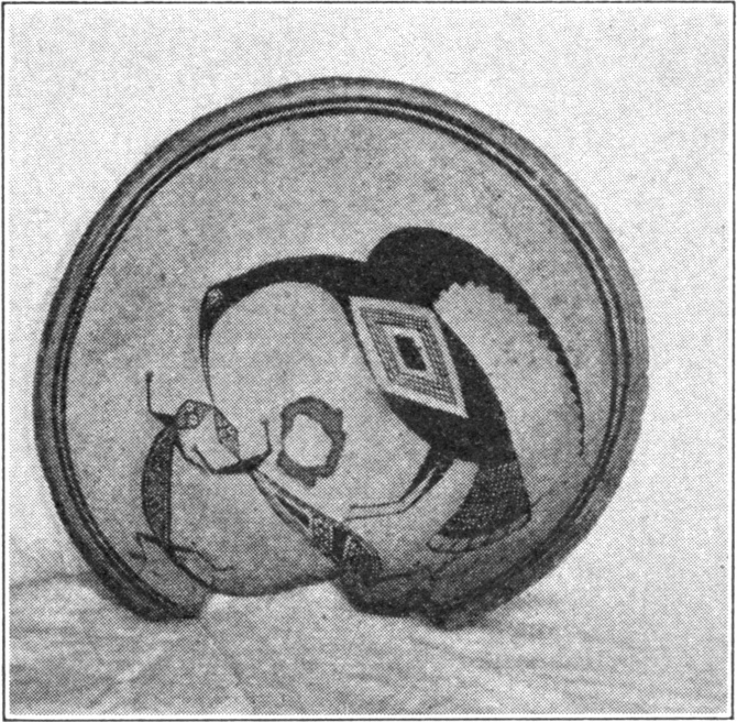 By far the most unusual group of human forms consists of two figures, one male, the other female, depicted on another bowl. The action in which these two are engaged is evident. The female figure has dependent breasts and wears a girdle. One hand is raised and brought to the face and the other carries a triangular object. The female figure has three parallel marks on the cheek, like the Hopi war-god. Behind the woman are several curved lines depicting unidentified objects.
