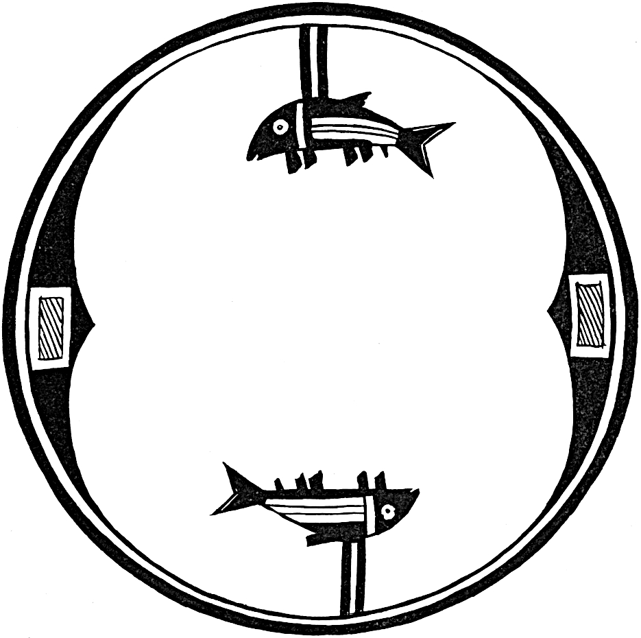 Another fish figured on a bowl from Oldtown, is unfortunately broken near the tail. The accompanying decoration has apparently another figure behind this fish, but its complete form is obscured by the perforation made in killing the vessel.