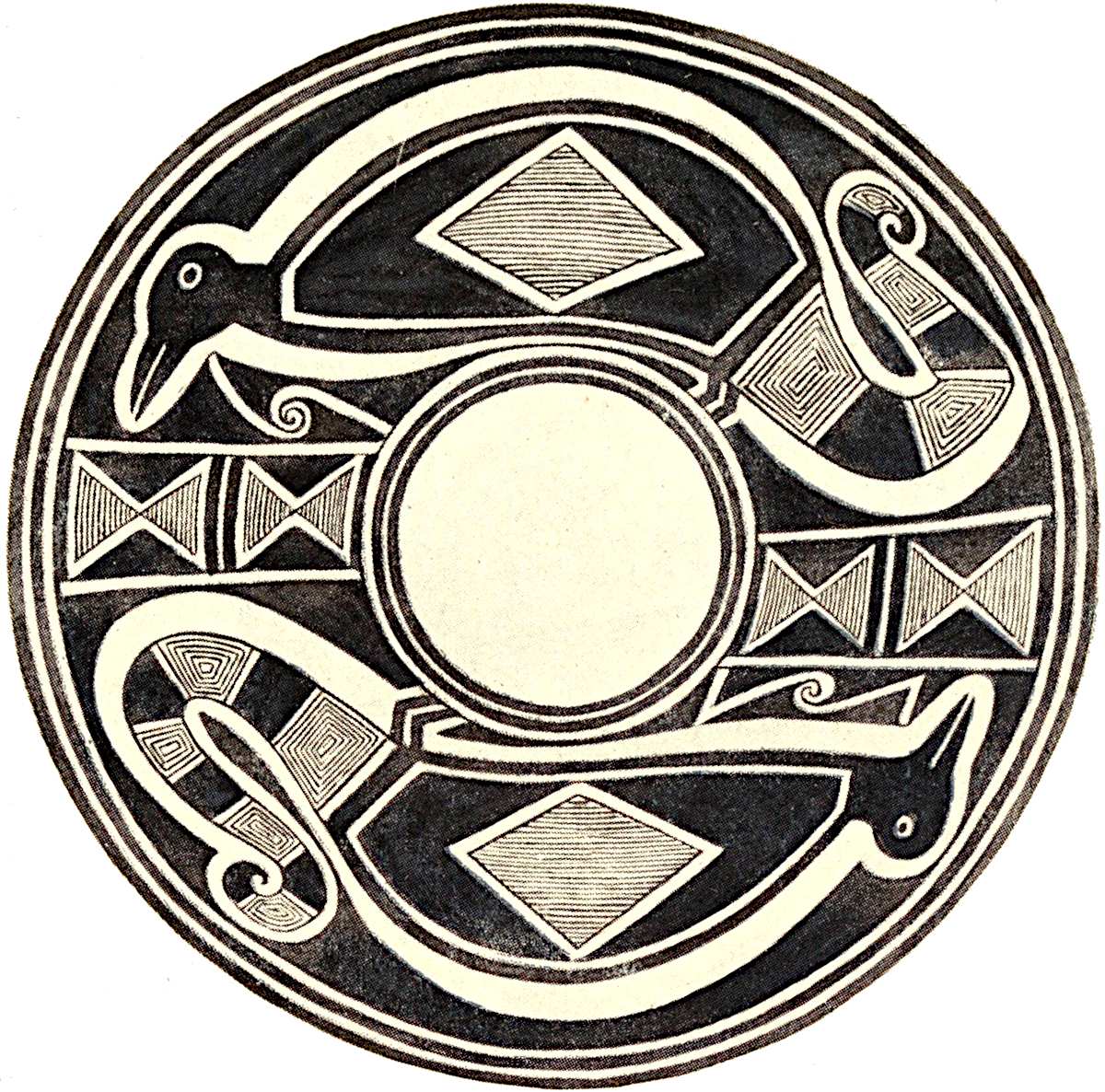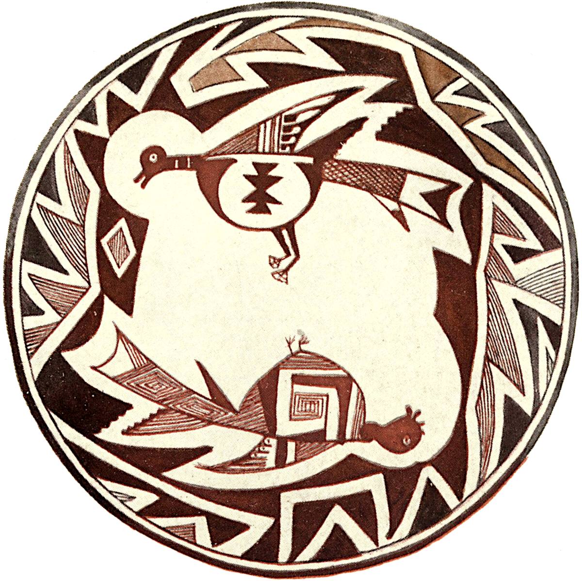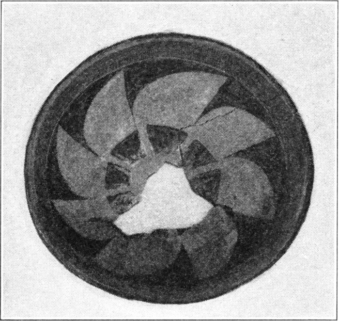The head is globular with two eyes on the back and a short pointed beak. As in all other zoic figures the geometric figures on the back of the body are the most characteristic. The middle of the body is occupied by an oval design through which may be seen the perforation with which the bowl was killed. At one end there is a triangular design with cross lines which extend partly over the oval figure where, except at one point, they are obscure.