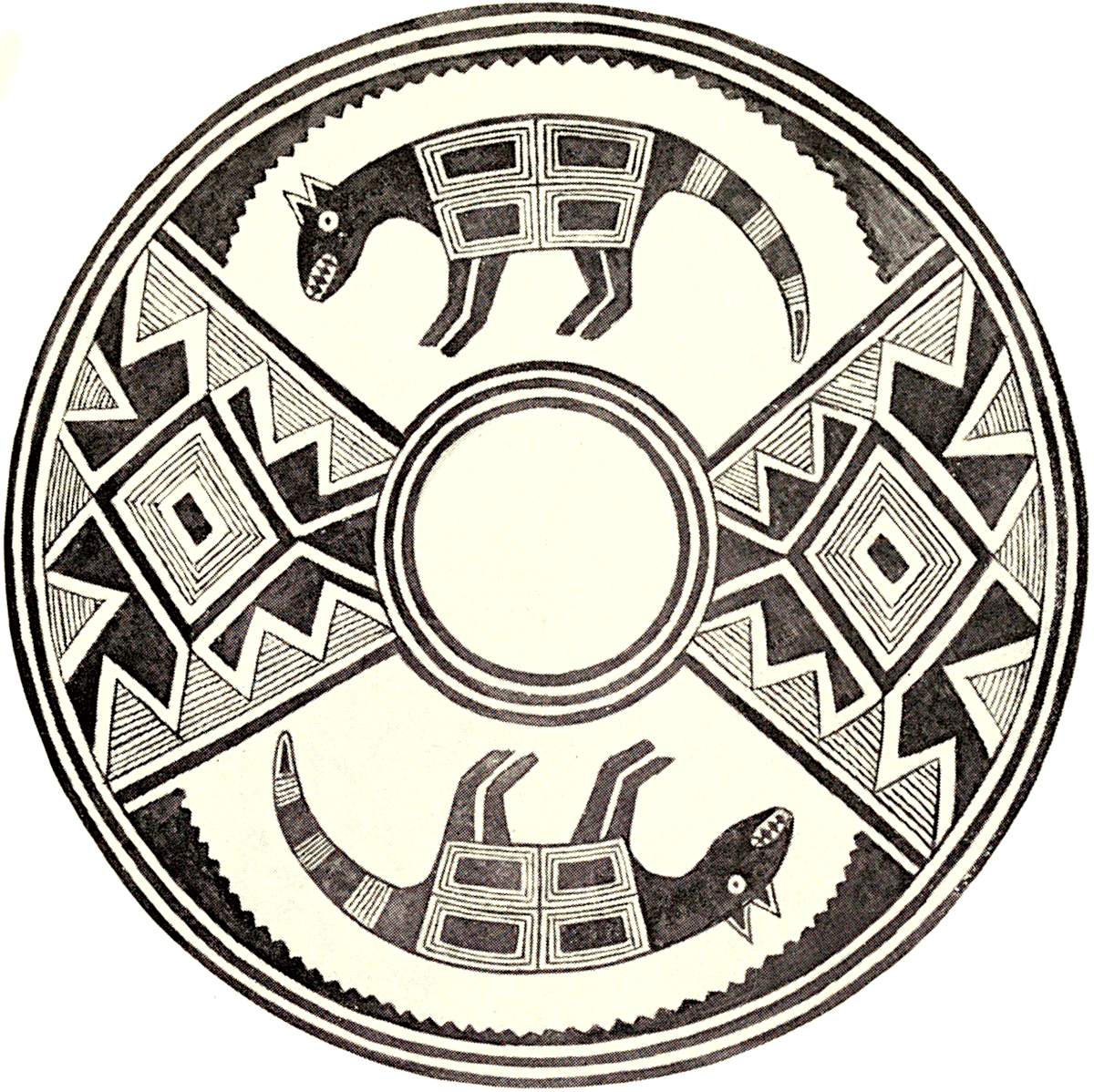 Unidentified Animal.—One of the most instructive figures of the collection appears in duplicate on a large food bowl (pl. 5, fig. 1). This vessel is black and white in color and measures fifteen inches in 41diameter by six inches deep. The two designs occur on the two sides of the interior of the bowl, the middle of which is left without decoration.