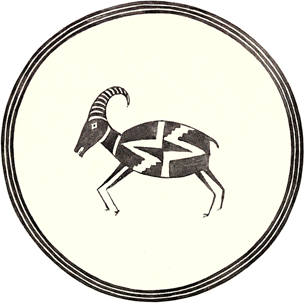 The zoic figures represent animals with square bodies, four legs, ears, head, and tail like a young antelope. There is no design on the side of the body, but in its place four broad parallel bands extend from the belly across the bowl. Each group of parallel lines changes its direction, widening in their course or near the ends where they enlarge for the accompanying figure. The markings on the necks of these figures suggest those on fawns.