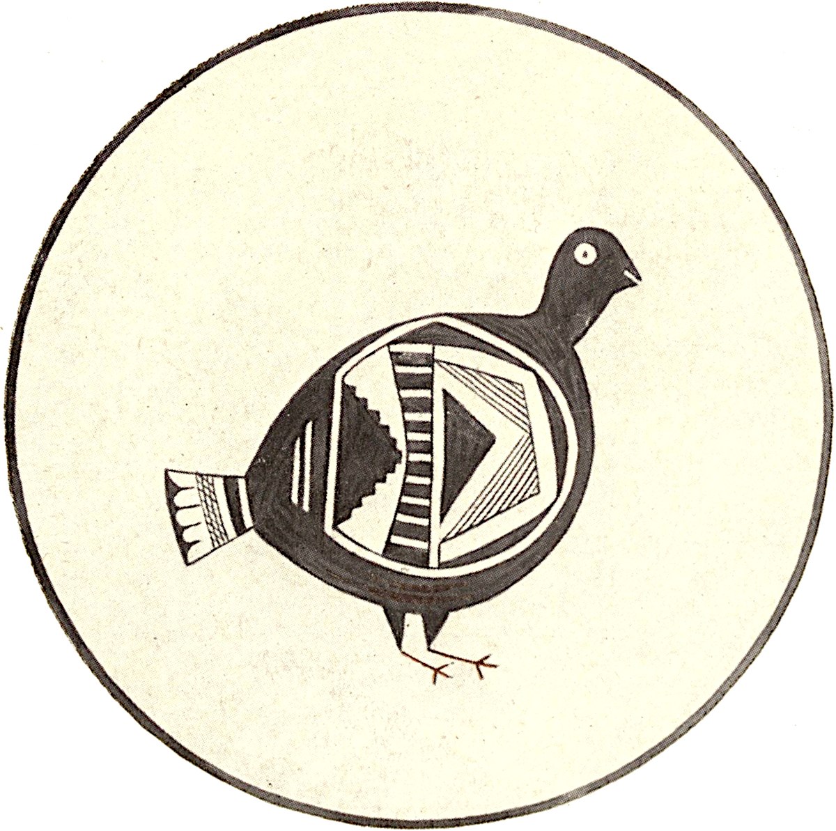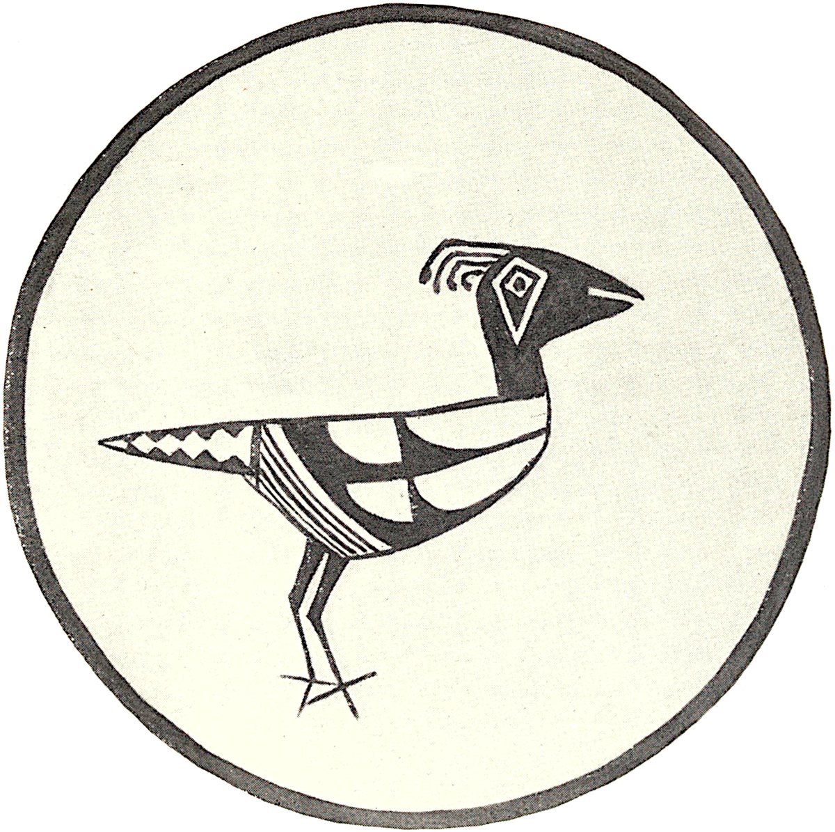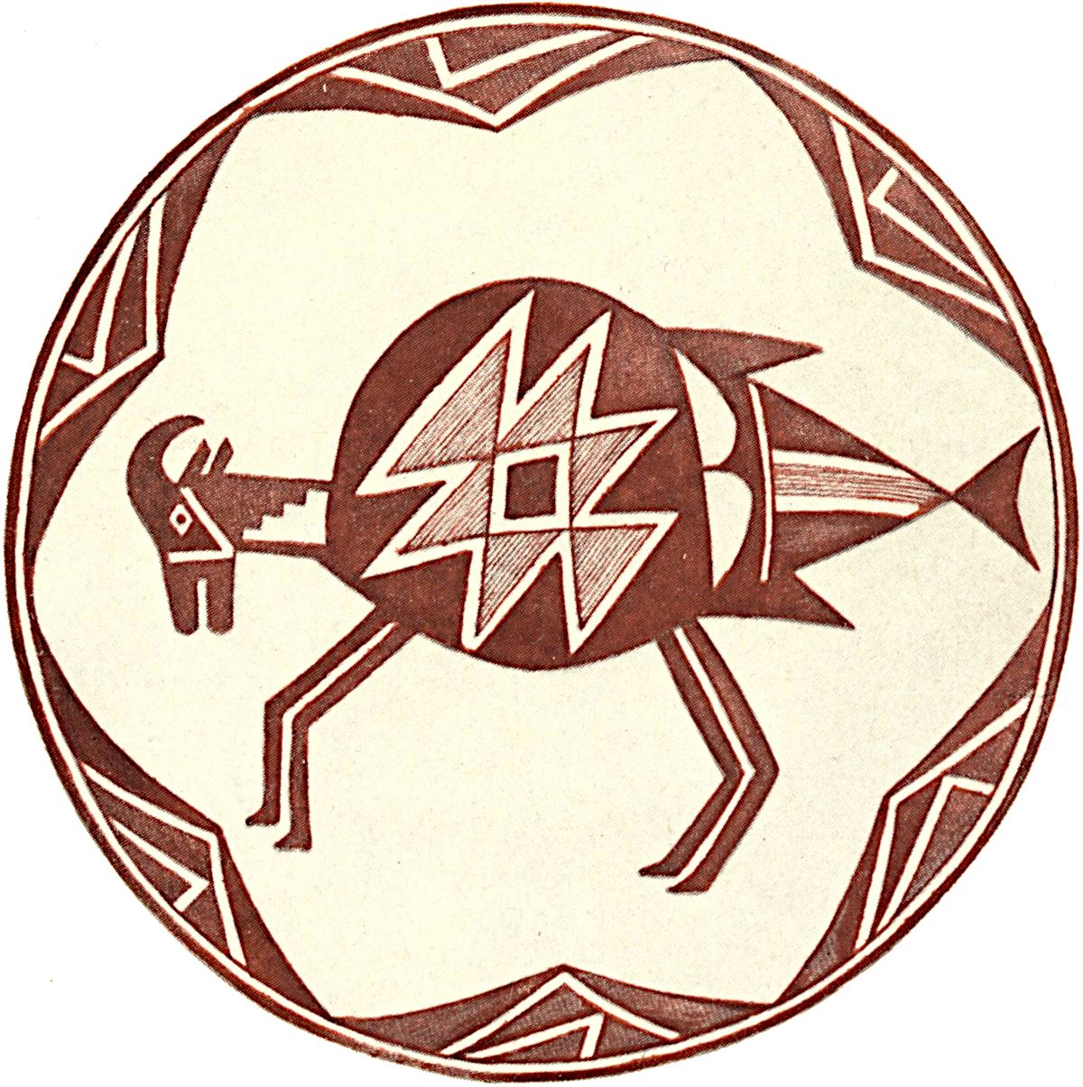 The presence of only two legs in this figure would seem to indicate that a bird was intended, but no bird has a tail like this figure; and the prehistoric potters of the Mimbres certainly knew how to draw a bird much better than this would imply. The exceptional features of this drawing, doubtless intentional, belong neither to flesh, fish, nor fowl, rendering its identification doubtful.