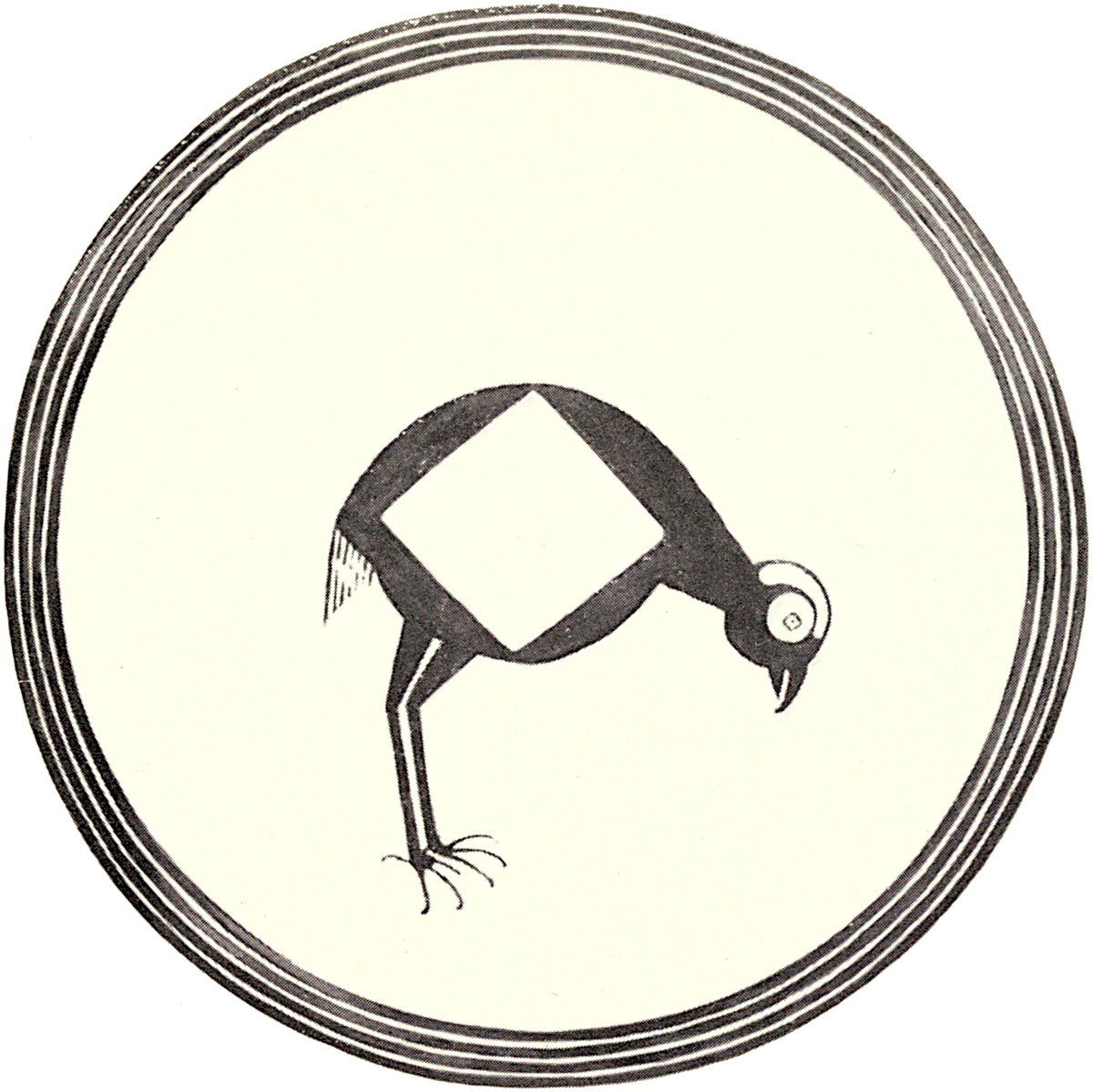 Bird C.—Bird C, shown in plate 4, figure 1, occurs on a black and white bowl that measures ten inches in diameter, five and one-half inches in depth. The figure occupies the circular zone in the middle of the bowl and is enclosed by parallel lines which surround the bowl near the rim. The top of the head, which is globular, is white in color, the beak projecting and the eyes comparatively large. The body is likewise globular and is covered by a square geometrical design the details of which are considerably obscured by the hole in the middle of38 the jar. A number of parallel lines of unequal length, turned downward, hang from the rear of the body and form the tail. The long legs suggest a wading bird, and the widely extended claws point to the same identification.