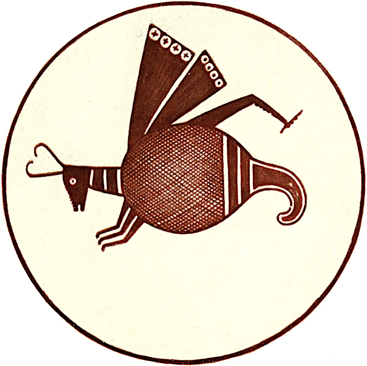 The body of this creature is elongated and tapers backward, being continued into a tail like that of the lizard. The head is long and the snout pointed. Only two legs are represented, and these are situated far back on the body near the point of the origin of the tail from the body. A lozenge-shaped symbol forms the geometrical design on the side.