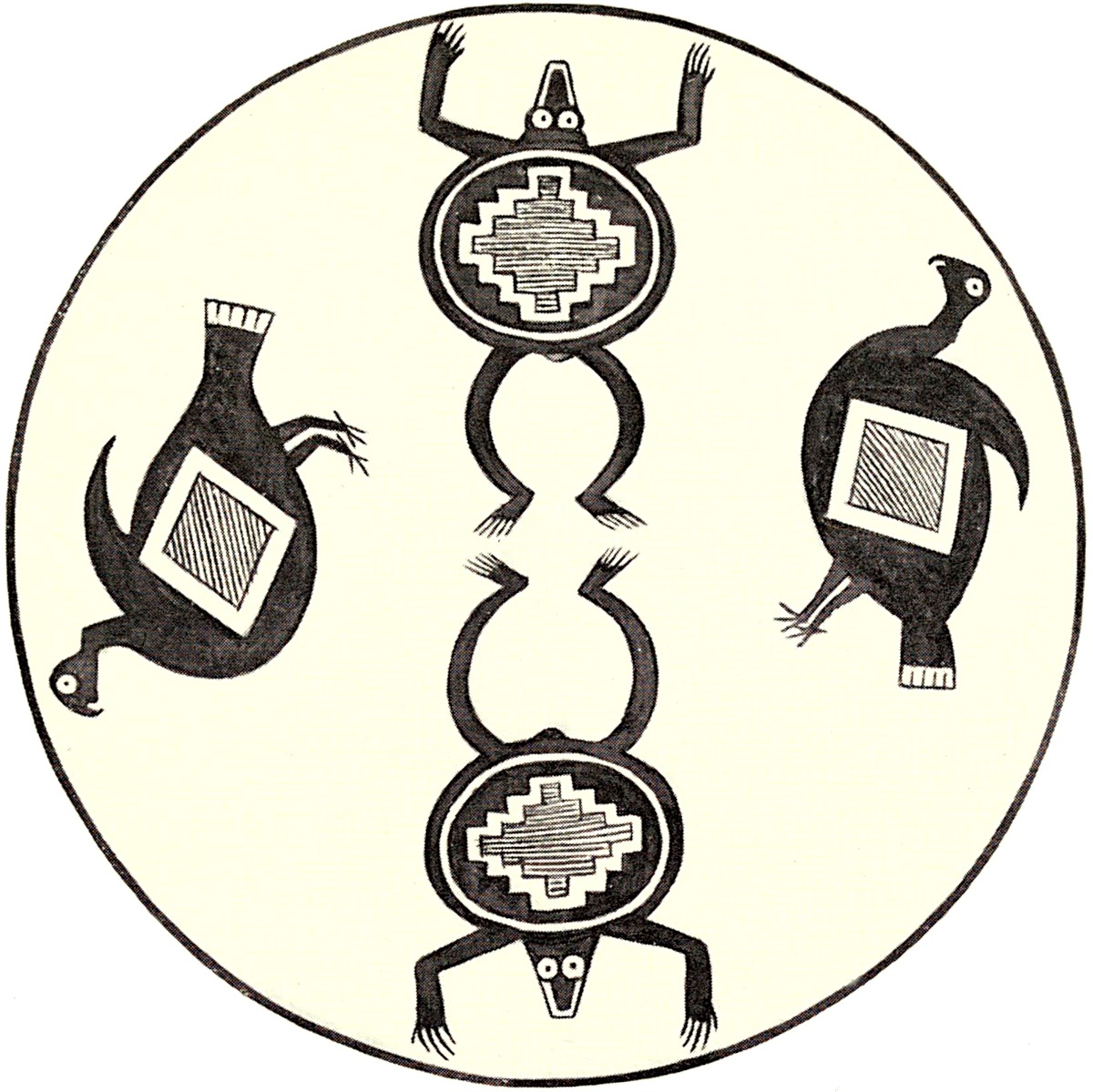 One of the few bowls obtained on which animals of two species were depicted on the same vessel was excavated by the author at Oldtown. This remarkably fine specimen (pl. 7, fig. 1) has figures of 43two birds and two frogs45 drawn in opposite quadrants, being unique in this particular. The two birds and frogs are not very unlike those already described but have certain characteristic features, especially in the geometric designs on their bodies.