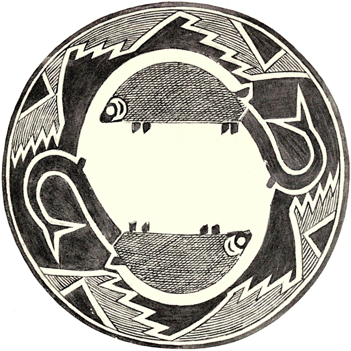 The most problematical of all the life figures on the Mimbres pottery is shown in plate 7, figure 2. This figure occurs on a black and white food bowl, eleven inches in diameter, four and one-half inches in depth. In support of the theory that the two figures here depicted represent fishes, we have the pointed head without neck, the operculum as a white crescentic design, two fins (pectoral, ventral, and anal), the median (adipose?) dorsal fin unpaired, and a long tail bifurcated at the extremity. The resemblance of these figures to the undoubted fishes on bowls previously mentioned is conclusive evidence that they represent the same animal.