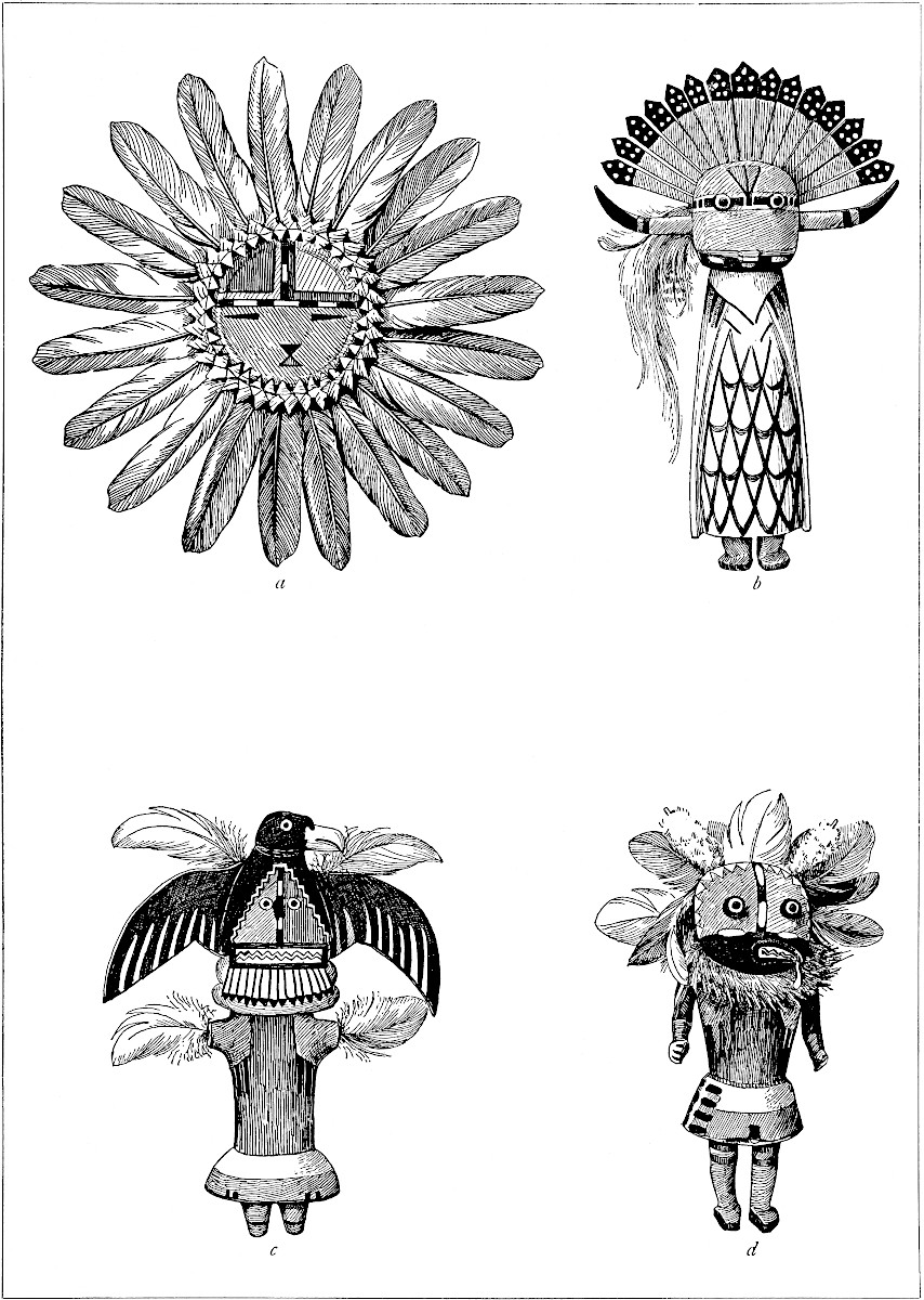 a, Common Hopi sun symbol. b, “Big-head,” a solar god. c, Kwátaka, bird with sun symbolism. d, Ahole.