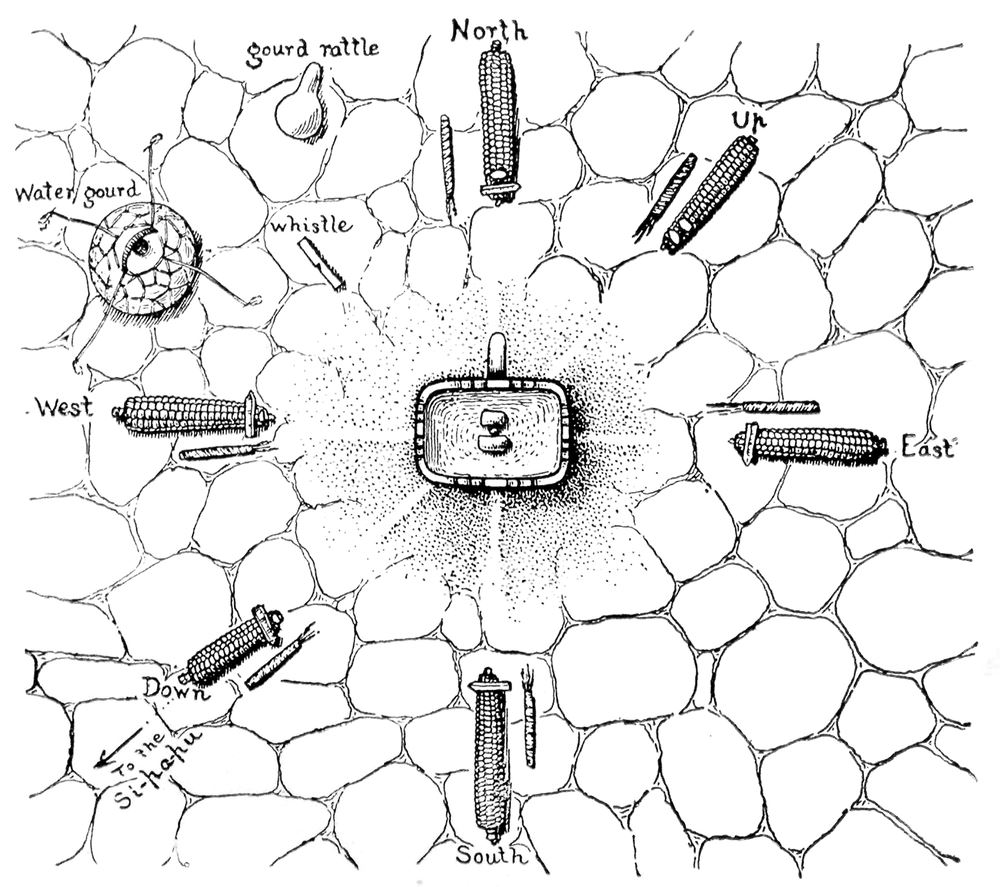 [32] In the shrine he put a paho, several nakwakwocis, and meal, after which he took a little honey in his mouth and spat to the four cardinal points. He gave a basket with a paho, sprouted beans, and other objects to Hahaiwuqti after he left him at the second meal figures.