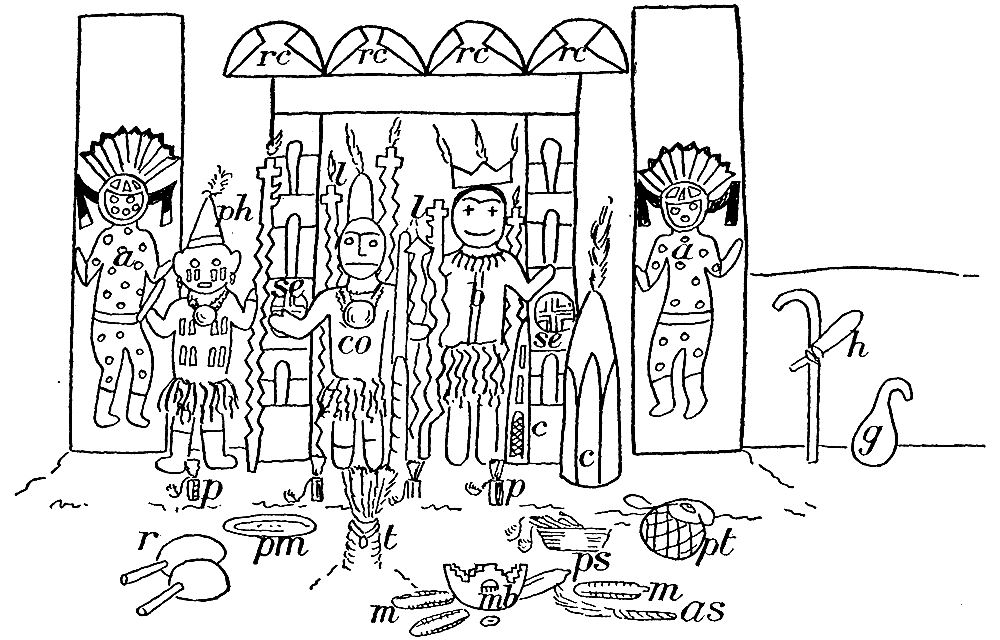 a, Tunwup, or Sun Katcina; as, Aspergill; b, Tcuelawu; c, Corn mound; co, Cotokinungwu; g, Gourd; h, Planting stick; l, Lightning symbols; m, Ears of maize; mb, Medicine bowl; p, Prayer sticks; ph, God of war; pm, Prayer meal; ps, Prayer sticks in basket; pt, Gourd (netted) for sacred water; r, Rattles; rc, Rain clouds; sc, Sun emblems; t, Tiponi.