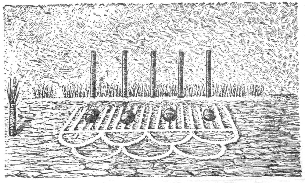 The Katcinas are tolled along by meal deposited on the trail by the priests. A trail is closed by a line of meal at right angles to the same.