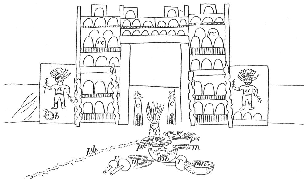 a, Tunwup, or Sun Katcina; b, Tcuelawu; c, Corn mound; l, Lightning symbols; m, Ears of maize; mb, Medicine bowl; pb, Path of blessing; pm, Prayer meal; ps, Prayer sticks in baskets; r, Rattles; rc, Rain clouds; t, Tiponi.