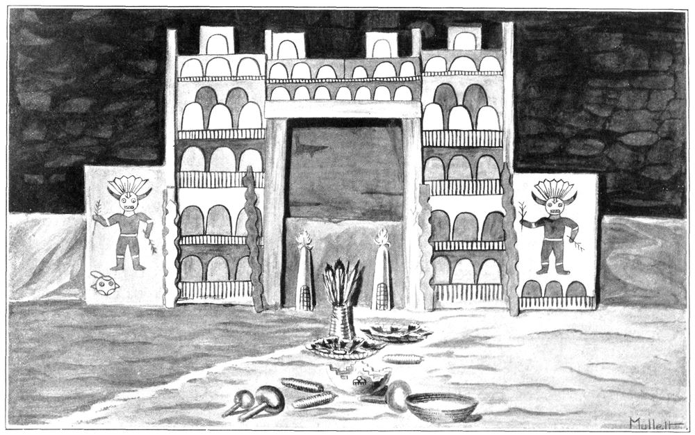 Four pahos, or prayer-sticks, are placed at intervals in hillocks of sand before the images on the altar. The Katcina tiponi,[6] or badge of the chief, stands on the floor before the altar.
