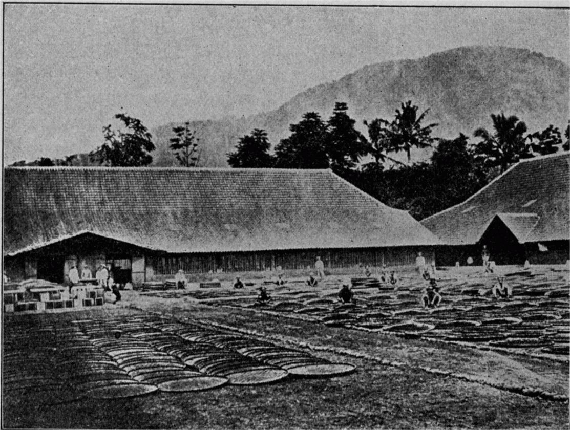 Tobacco is extensively grown in Java, but one does not hear much about it, because a great deal of it is sold as "Sumatra" leaf. Tea-growing has become a great industry310 in Java and the tea in quality is as fine as that grown in China. Women and girls are the pickers. They work with head and arms bare, each wearing a loose gown resembling a Japanese kimona without sleeves. As fast as they are picked the leaves are piled on squares of white cloth. When the cloth contains enough to make a bundle of good size the picker carries it on her head to the factory, where the leaves are first wilted, rolled into compact form and then dried on great stone floors that are shielded from the sun. The hundreds of pickers with their brightly colored gowns and white bundles, form a wonderful kaleidoscope picture.