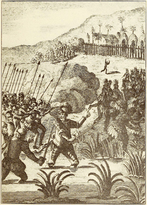 The Indians appeared, most of them armed with bows and arrows. The bowstrings were made of the sinews of some animal or stag’s hair, and the arrows were tipped with sharp bones. In addition to these they carried spears which could be thrown from a distance or used as a hand-weapon. One of their most terrible weapons was a great battle sword, made of very hard wood, the edge of which was formed of exceedingly sharp stones, joined together, and which was so heavy that it had to be wielded with both hands, like an axe. Some of them had clubs, others slings with which they could hurl stones of great size with unusual force and accuracy. The leaders alone protected themselves with quilted woollen coverings, and wooden or tortoise shell shields. The rest went naked, but to give them a frightful appearance they painted their faces and bodies in different colors, and to increase their stature they wore headdresses of tall feathers. Their battle music was in keeping with their looks. They used reed pipes and large sea-shells as wind instruments, and drums made of hollowed tree trunks. The art of fighting in close ranks was entirely unknown to them. They observed a certain order, however, by dividing the whole force into little squads, each with its own leader. They had this in common with the European plan of battle, that they did not engage all their warriors at the same time in a fight, but kept a part in reserve to come to the help of those in front when it should be necessary. Their opening assault was always made with frightful outcries and with great vigor, but if the enemy withstood the first attack and succeeded in throwing the advance into disorder, a panic would strike them and a general retreat ensue.