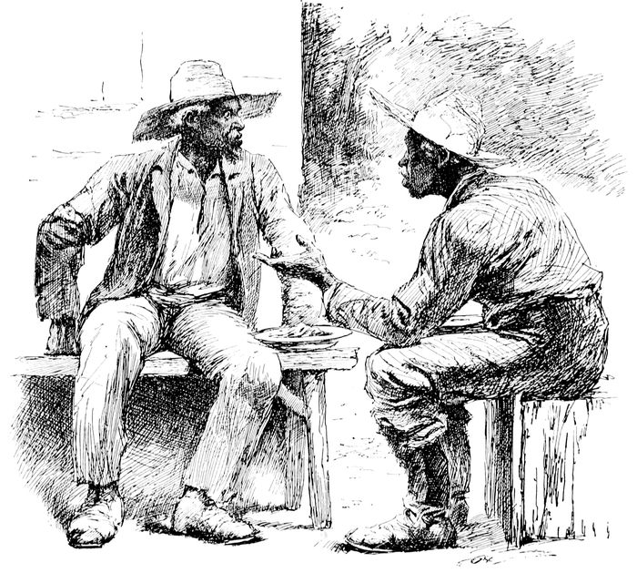 “Yasser,” said the old man with a serious air, “dat des w’at I wuz a-doin’. I done clean fergit myse’f. I year tell dat dem w’at take en talk ’long wid deyse’f dat dey owe de Ole Boy a day’s work. Ef dat de state er de case den he done 189got my name down on de books, en hit’s all on account er deze yer uppity-biggity niggers w’at come ’long yer little w’ile ago en ax me ter go ’way off yan ter de Spivey place whar Nancy’s Jim gwine ter git married.