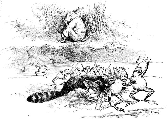 “W’iles dish yer wuz gwine on Brer Rabbit wuz in de crowd, en he wuz des ez big a man ez any er um, en I dunner ef he want de bigges’. Well, Brer Rabbit he move en secondary[2] dat bein’ ez how Brer Polecat wuz sech a nice king 185dey oughter pass a law dat eve’y time de yuther creeturs meet um in de road dey mus’ shet der eyes en hol’ der nose. Some er um say dey don’t min’ holdin’ der nose, but dey don’t like dish yer way er shettin’ der eyes, kaze dey mout run up agin a tree, er stick a brier in der foot; but Brer Rabbit, he up en ’low, he did, dat ’t wuz des ’bout ez little ez dey kin do ter shet der eye en hol’ der nose w’en dey git war sech a nice king is, en so dey all hatter come ’roun’.