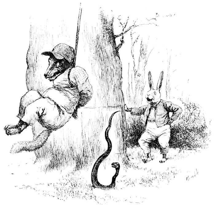 187“So he squat down en fix hisse’f, en des ’bout de time w’en he wuz ready fer ter ’stroy de gingercakes, yer come old King Polecat. Brer Rabbit, he got up, he did, en made a bow, en den he helt he nose en make like he wuz a-shettin’ he eyes. Ole King Polecat, he come ’long, he did, en start fer ter pick up de gingercakes, but Brer Rabbit holler out: